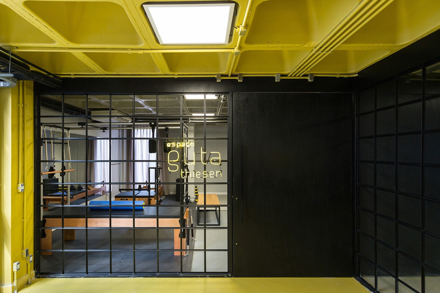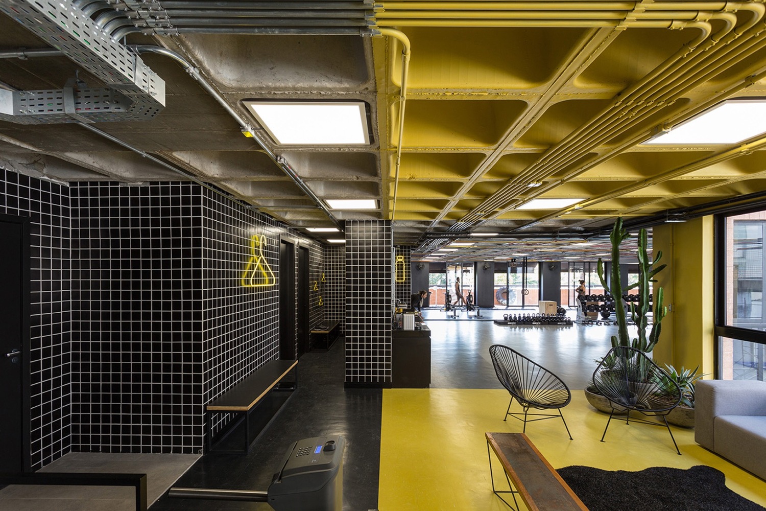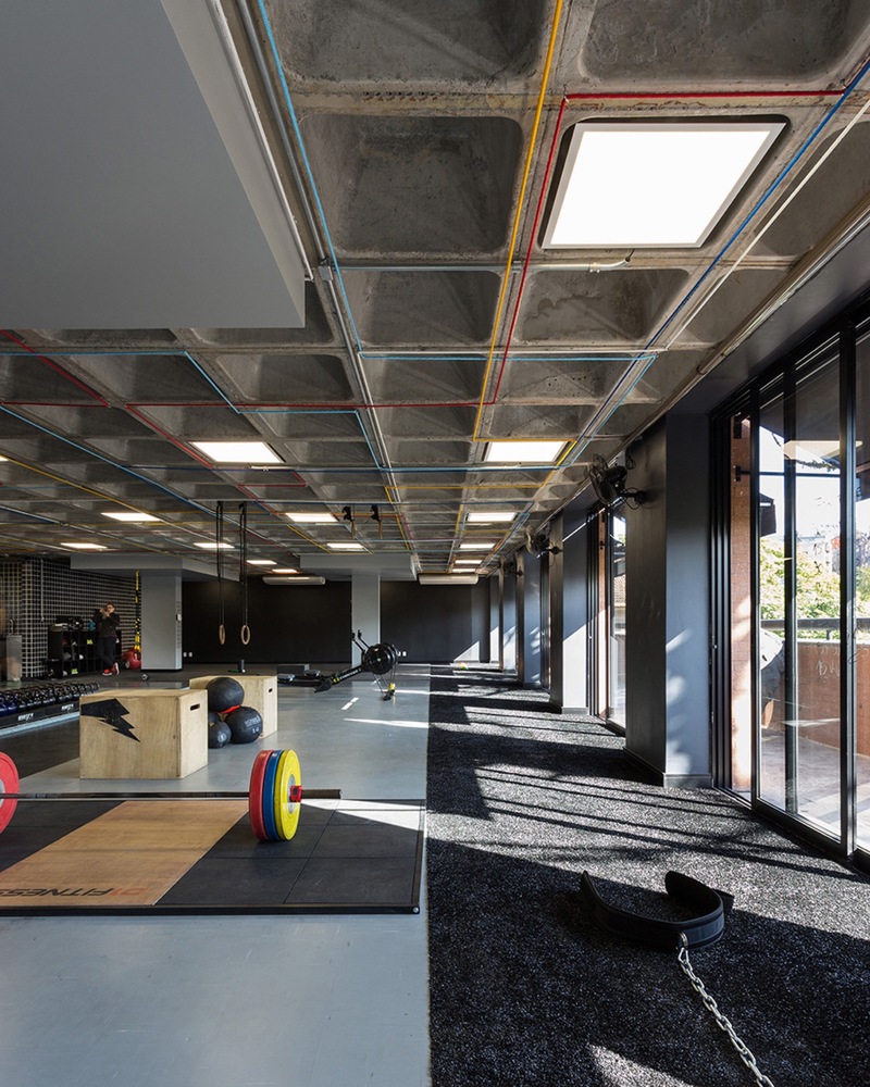 Pretto健身工作室專注于功能訓練和運動調理。這個工程為舊場館改造,設計方案由設計師Nacional操刀設計。工作室位于一個新建商業樓的整層樓,其特色是利用原始混凝土板來搭配黑色與黃色,實現通透的工業風效果。